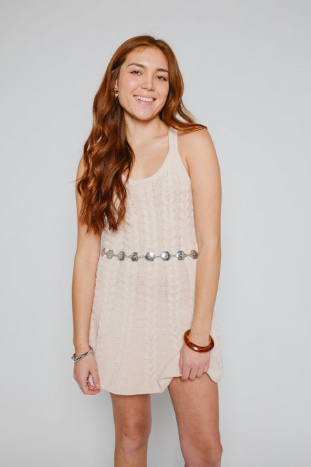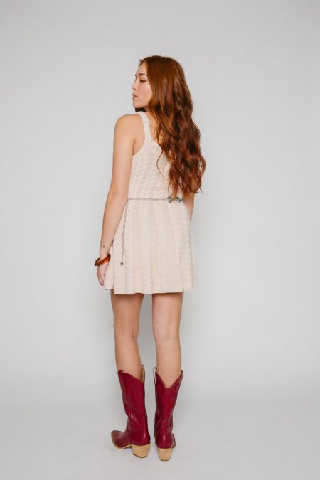 Details Sleeveless mini dressMedium weight cable knit fabric Flowy skirtStretchy fabricBelt sold separatelyFull length of a size medium from the center of neckline: 26 inches Materials and Care 100% cottonHand wash coldHang to dry All sale items are final sale.