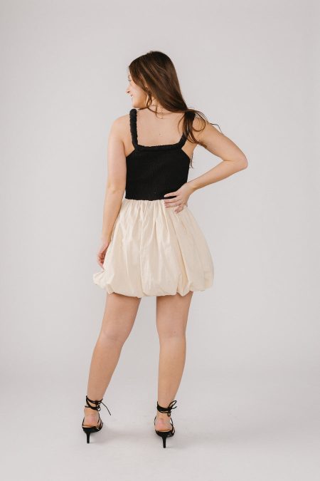 Details Black and oatmeal mini dressChunky, gathered fabric straps and necklineSleevelessSquare necklineBubble skirtSmocking on back Full length of a size medium from the center of neckline: 27 inches Materials and Care Self: 85% Cotton, 15% LinenLining: 100% PolyesterHand wash coldLine dry All sale items are considered final sale.