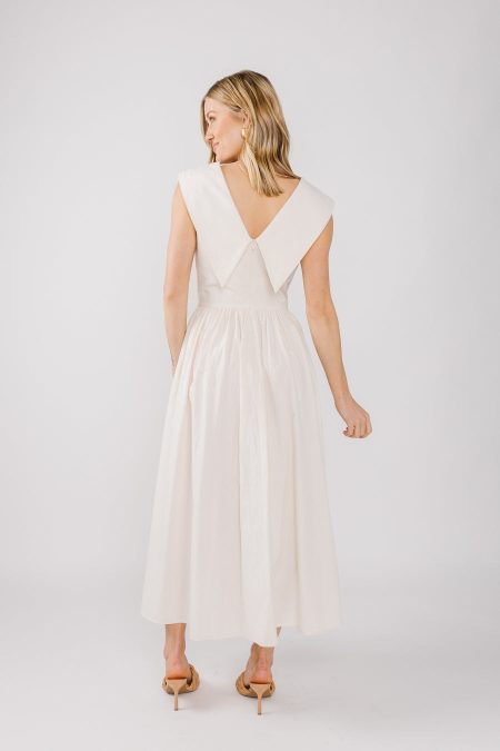 Details Cream midi dressV necklineWide front and back collarSleevelessSide pocketsHidden back zipperFull length of a size medium from the top of shoulder: 48 inches Materials and Care 100% cottonHand wash coldLine dry All sale items considered are final sale.