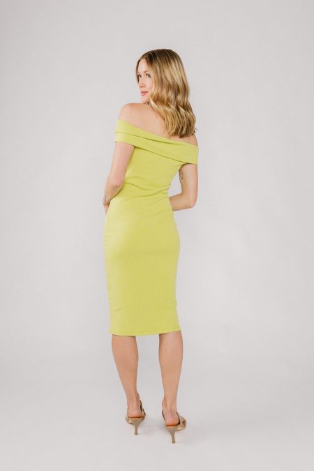 Details Lime green ribbed knit dressMidi lengthOff shoulder with foldover bandFitted silhouette with stretchFull length of a size medium from center of neckline: 37 inches Materials and Care Self: 75% polyester, 25% rayonHand wash coldLine dry All sale items are final sale.