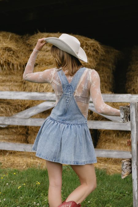 Details Medium wash denim overall dressAdjustable button shoulder strapsFront pocketMini lengthHidden side zipperFull length of a size medium from center of neckline: 26 inches Materials and Care 100% cottonHand wash coldHang to dry All sale items are final sale.