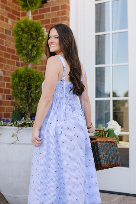 Details Blue and white gingham dressCherry printMidi lengthButtons up backSide pocketsAdjustable tie straps on back of shouldersFully lined Full length of a size medium from the center of neckline: 40.5 inches Materials and Care Self: 100% CottonLining: 100% PolyesterHand wash coldLine dry All sale items are considered final sale.