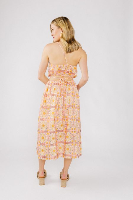 Details Pink and orange print dressMidi lengthCut out sidesOpen backSleeveless with one shoulder strapHigh necklineAdjustable strap around one shoulderElastic at bust and back with self-tie detailPartially linedFull length of a size medium from center of neckline: 45 inches Materials and Care Self: 100% polyesterLining: 90% polyester, 10% spandexHand wash coldLine…